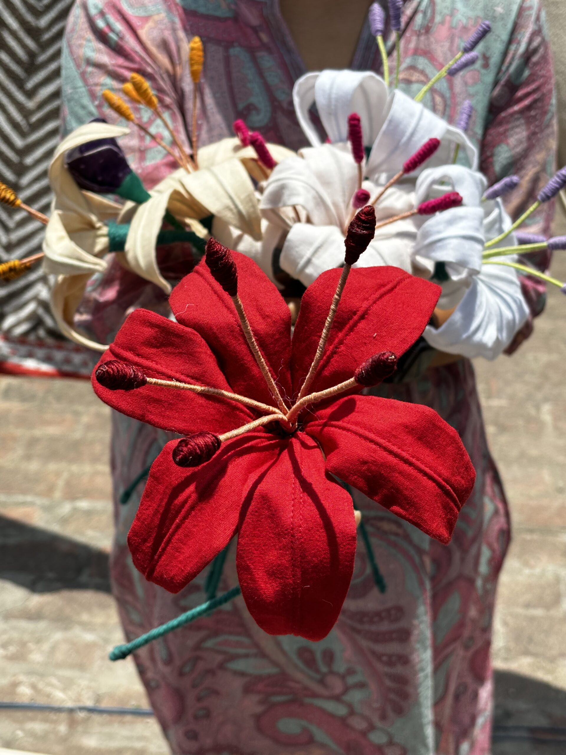 The handmade fabric lily flower by Little Llama is a beautiful blend of artistry and craftsmanship. Each flower is meticulously crafted from high-quality, soft cotton fabric, ensuring a delicate yet durable piece. The petals are designed to mimic the natural shape and texture of real lilies, featuring subtle curves and gentle folds that create a lifelike appearance.